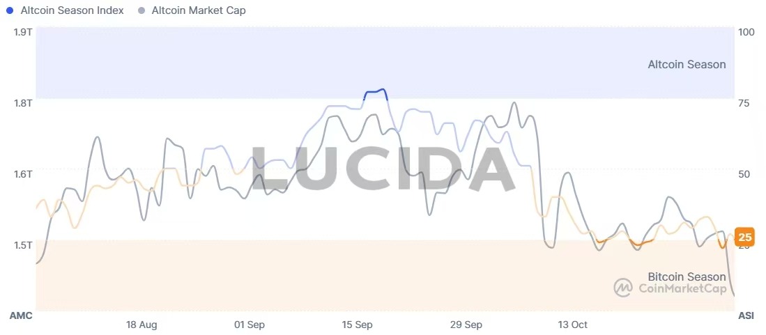 The core logic of the Altcoin Season Index is to measure how many major altcoins outperform Bitcoin over a specific period. When the index falls below 75, especially into the 20-30 range (signifying “Bitcoin Season”), it indicates that capital is flowing out of higher-risk altcoins and into the more stable Bitcoin. This typically characterizes periods of market de-risking or the early stages of a bull market. This trend was evident by the end of October, when the index stood at 32, confirming a market shift into a risk-off mode.