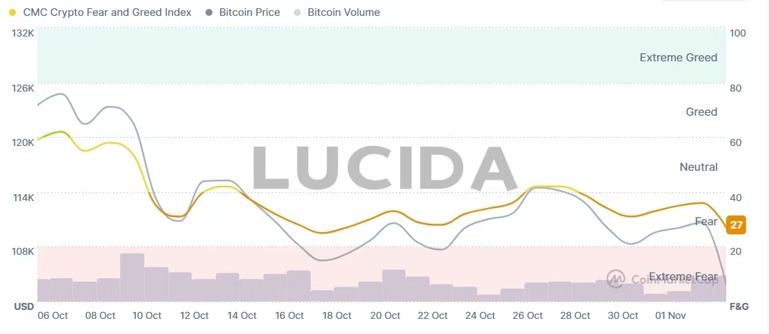 The Crypto Fear & Greed Index experienced a dramatic swing from “Greed” to “Extreme Fear” between October and early November. On October 5th, the index reached a “Greed” high of 74, coinciding with Bitcoin prices nearing their all-time peak. However, as the market plunged due to macroeconomic concerns (such as the threat of Trump’s tariffs) and internal structural risks (like high-leverage liquidations), the index plummeted to 21 by November 4th, entering the “Extreme Fear” zone. This extreme emotional reversal not only reflects the fragility of investor confidence but often serves as a contrarian indicator for identifying short-term oversold conditions or potential rebound opportunities—some analysts believe such intense market anxiety could signal the formation of a temporary bottom. Furthermore, during October’s crash, Bitcoin dominance rose, while overall market trading volume and social sentiment declined across the board, collectively pushing sentiment firmly into the “fear” territory.