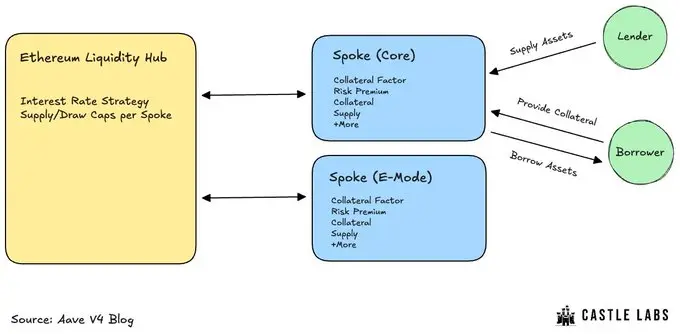 A complementary innovation is **Spokes**, specialized market instances that connect directly to the Liquidity Hub. Each Spoke can be configured with independent parameters—for example, supporting long-tail assets or setting specific supply and borrowing caps. The Liquidity Hub then ensures that all Spoke parameters operate within the overarching system rules. This modular design allows for “edge innovation” and experimentation while safeguarding the security and stability of the core system.