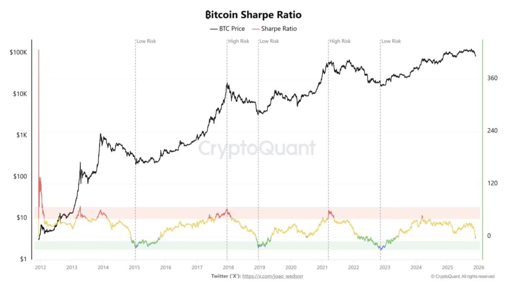 Adding another layer to market analysis, a compelling chart depicting Bitcoin’s Sharpe Ratio has been circulating among crypto investors. This chart illuminates the historical relationship between Bitcoin’s market cycles and its Sharpe Ratio. Historically, when the Sharpe Ratio enters the “green zone,” it signals that Bitcoin’s price is in a bottoming-out phase. A transition to the “blue line” then indicates the precise cycle bottom. Intriguingly, the current data shows the Sharpe Ratio just beginning to turn green, potentially indicating the nascent stages of a bear market. Given its remarkable accuracy over the past decade, this indicator is drawing considerable attention.