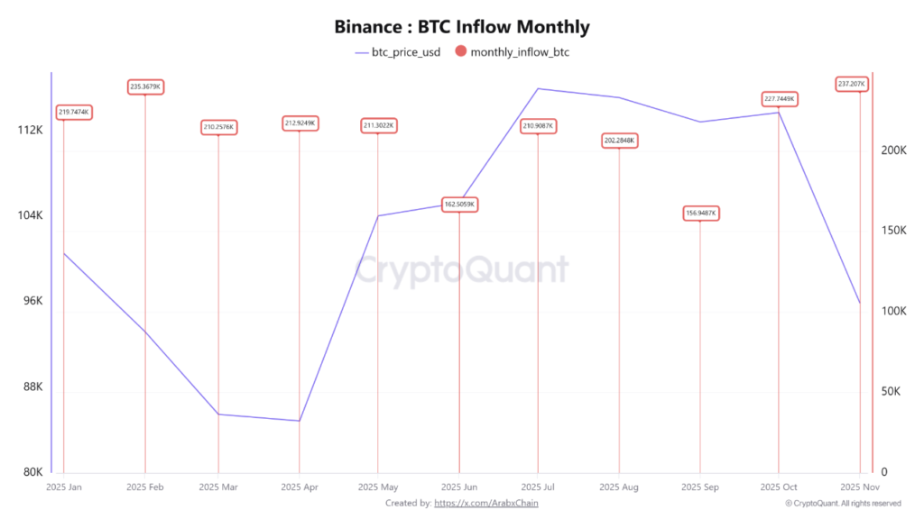 New data from Arab Chain, analyzing Binance’s capital flow, reveals a significant surge in Bitcoin inflows during November. The platform recorded its highest monthly total for the year, with approximately 237,000 BTC flowing in. This dramatic increase, a substantial leap from previous months, signals a recent uptick in trading activity on the exchange. The rebound in inflows, especially after mid-year market volatility, points to a notable shift in trader behavior, particularly among short-term investors who are highly responsive to market fluctuations.