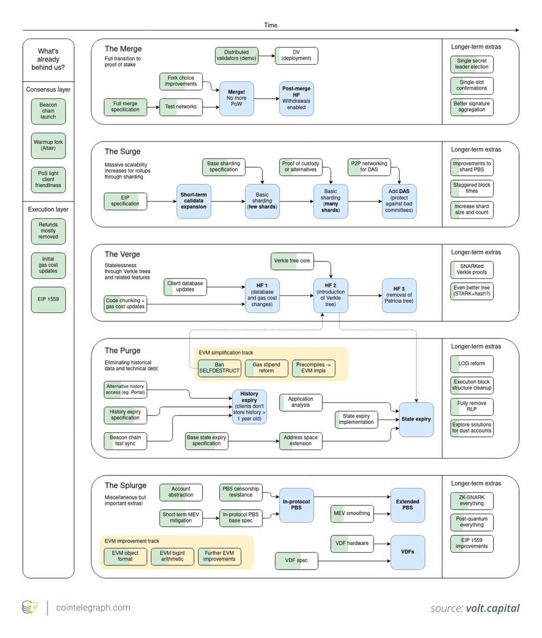 These upgrades meticulously align with Vitalik Buterin’s high-level roadmap: Merge, Surge, Verge, Purge, and Splurge. The “Surge” phase is dedicated to scaling Ethereum through Rollups and enhanced data availability, while “Verge” and “Purge” focus on enabling lighter clients and systematically removing outdated historical data.