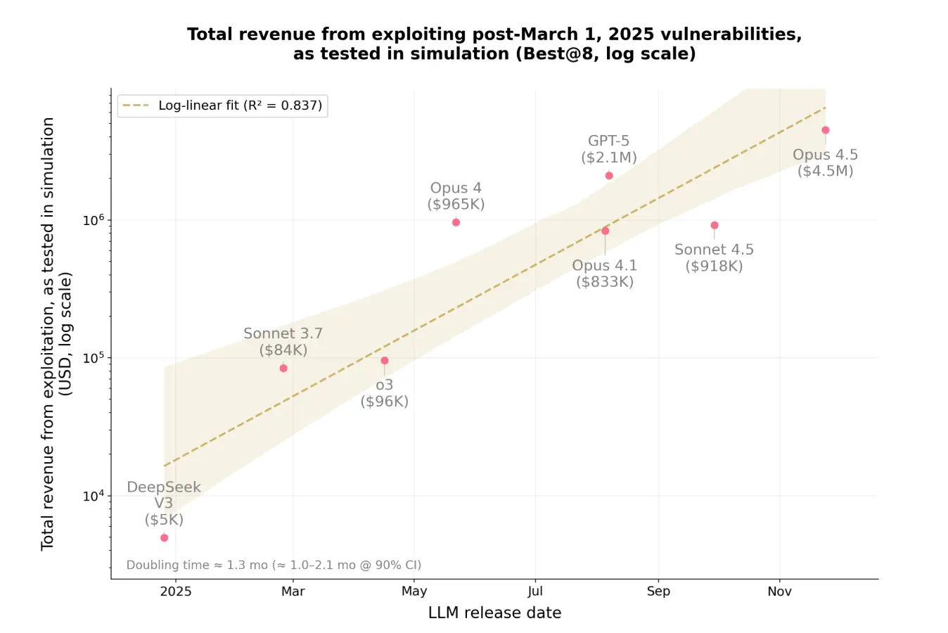 - Mitigating Data Contamination (Post-Knowledge Cutoff): To control for potential data contamination, Anthropic re-evaluated the same 10 models against 34 contracts exploited after March 1, 2025—a date chosen as the most recent knowledge cutoff for many of these models. Opus 4.5, Sonnet 4.5, and GPT-5 successfully exploited 19 (55.8%) of these, simulating thefts up to $4.6 million. The top performer, Opus 4.5, alone exploited 17 (50%) contracts, simulating $4.5 million in theft.