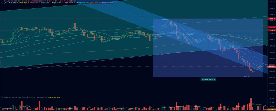 From a technical perspective, BTC momentarily breached the critical “Trump bottom” support zone, defined by the $90,000-$110,000 range, and traded below its 360-day moving average for three consecutive weeks. This movement effectively confirmed a “bull-to-bear” transition on a daily timeframe, with weekly confirmation actively unfolding. The ultimate monthly confirmation, however, remains to be seen.