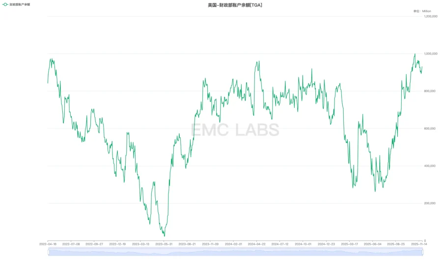 By November 12, the US government shutdown had extended for an unprecedented 43 days. During this period, while fiscal expenditures were severely curtailed, revenues from taxes and tariffs continued to flow in. This created a significant accumulation of cash, effectively a “receipts-only” scenario, which directly inflated the US Treasury General Account (TGA) balance held at the Federal Reserve. This mechanism acted as a powerful “liquidity drain” from the broader market.