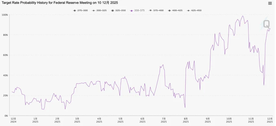 Further bolstering this sentiment, the Federal Reserve’s Beige Book, released on November 26, confirmed a deterioration in economic and employment conditions. This critical information alleviated market anxieties that the Fed might opt for a conservative stance and refrain from cutting rates in December due to insufficient economic and employment data. Consequently, the FedWatch probability for a December rate cut steadily climbed above 80%, effectively transforming what Powell had described on October 30 as “far from a done deal” into a virtual certainty within a month.