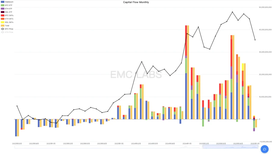 Firstly, an analysis of comprehensive cryptocurrency market fund flows via the eMerge Engine reveals that the crypto market experienced a net outflow exceeding $3.6 billion in November. Breaking this down, BTC ETF channels accounted for $3.382 billion in outflows, ETH ETF channels saw $1.352 billion in outflows, and stablecoins registered $615 million in outflows. Interestingly, SOL ETF recorded a positive inflow of $412 million, and BTC/ETH/SOL treasury companies collectively reported net inflows totaling approximately $1.298 billion.