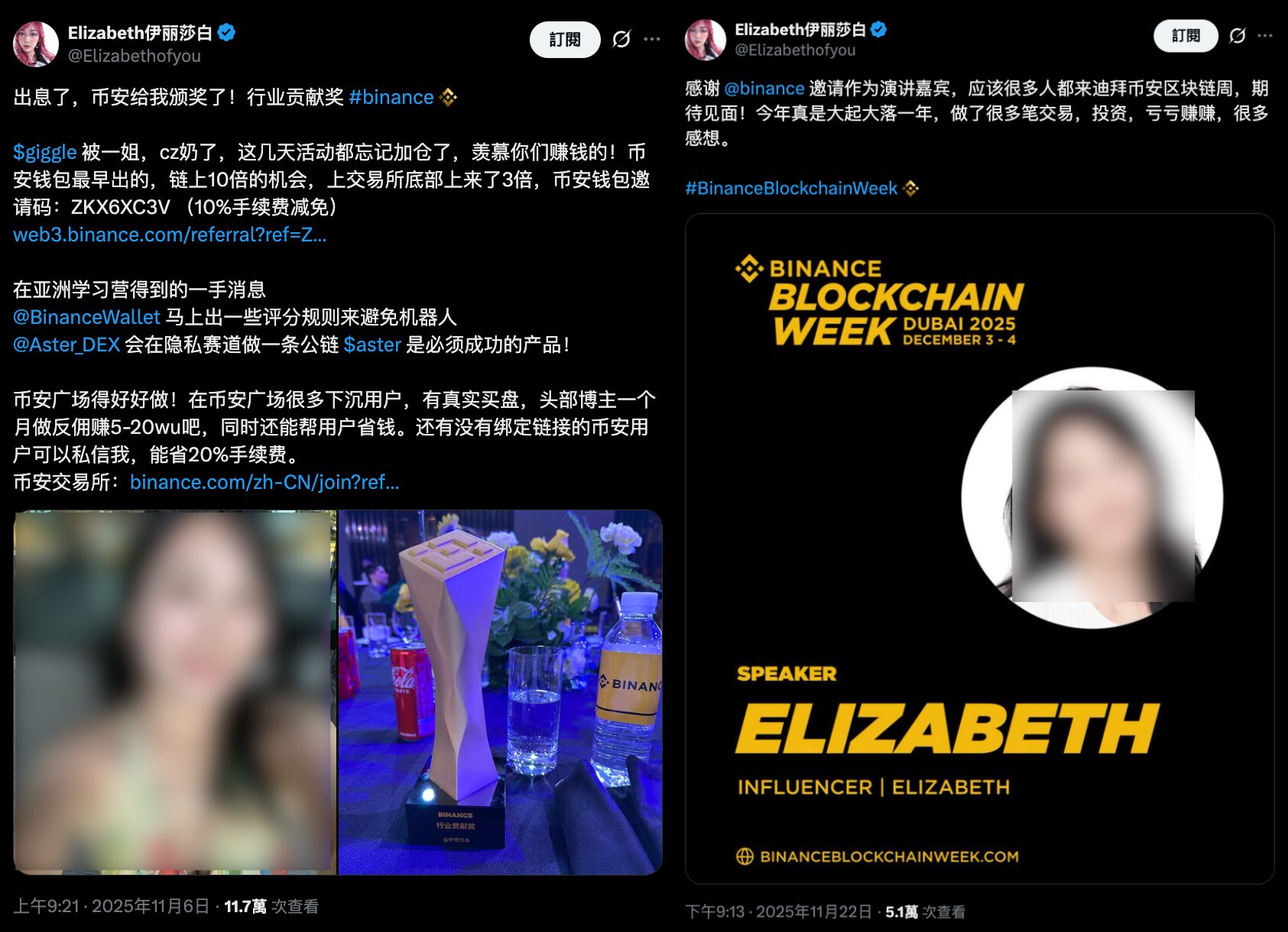 Compounding the controversy, it was revealed that Elizabeth had previously received the “Best Industry Contributor” award at a Binance-hosted event, standing alongside other prominent crypto creators. She was even invited by Binance to be a guest speaker at the upcoming Binance Blockchain Week. This background makes it even harder for many netizens to accept her alleged “fake donation for real engagement” during a tragic disaster.