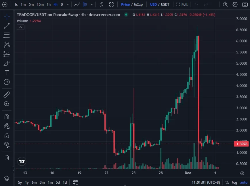 Tradoor, another project launched on Binance Alpha, saw its token, TRADOOR, briefly touch an all-time high of $6.64 on December 1. However, this peak was short-lived, as the token then plummeted by nearly 80% within the next 24 hours, crashing to $1.47. It currently trades around $1.39.