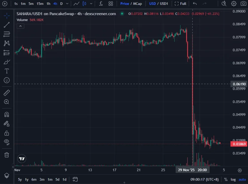 On the evening of November 29, Sahara AI’s token, SAHARA, suffered a brutal blow, plummeting over 50% in a short span. Its price has since struggled to recover, currently hovering around $0.03869.