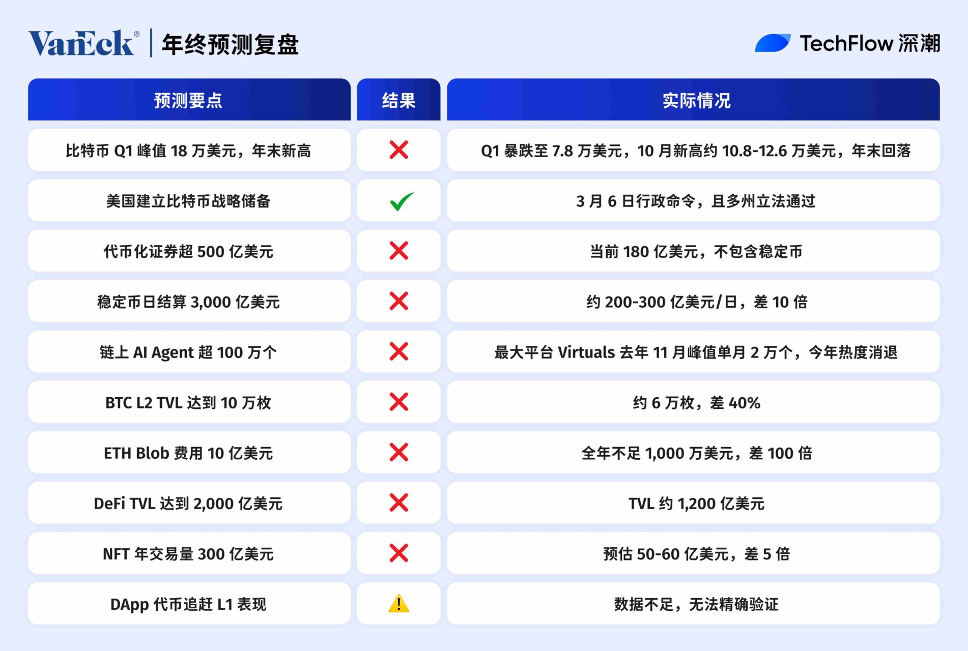 The remaining nine predictions were not just slightly off, but often erred by orders of magnitude. For instance, VanEck projected a crypto market peak in Q1 2025, with Bitcoin reaching $180,000, followed by new highs by year-end. In reality, both the timing and price targets proved to be diametrically opposite to market performance this year.