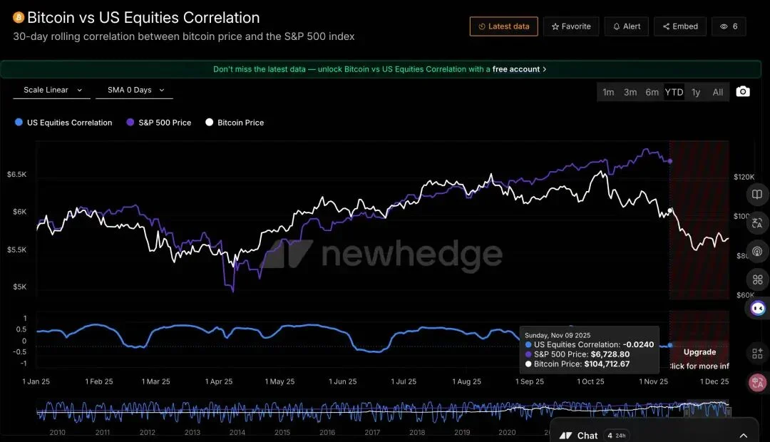 Theoretically, BTC has often been seen as either “digital gold” or a “risk asset.” As digital gold, it should appreciate during market panic, exhibiting a negative correlation with equities. As a risk asset, it should track movements in indices like the Nasdaq, performing well during periods of abundant liquidity. In recent years, BTC has predominantly behaved as the latter. CME research shows BTC’s correlation with the Nasdaq 100 surging from near zero in 2020 to around 0.4, occasionally exceeding 0.7. The Kobeissi Letter recently highlighted BTC’s 30-day correlation reaching 0.8, its highest since 2022.