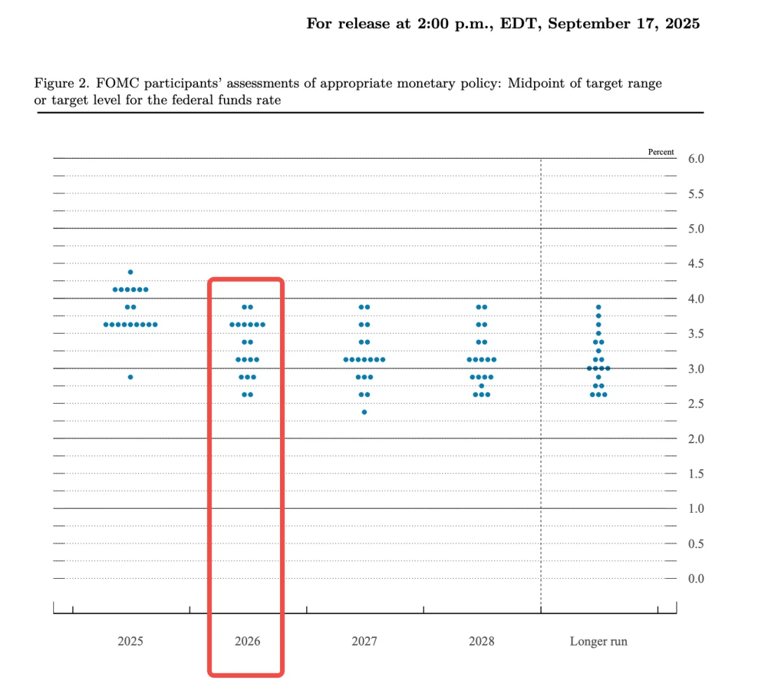 The divergence becomes even more pronounced when examining 2026. While the current rate stands at 3.75%-4.00%, a drop to 3.4% by next year-end would imply only 1-2 cuts for the entire year. However, the dot plot shows members projecting rates as low as 2.5% (suggesting 4-5 cuts) and others advocating for rates to remain at 4.0% (no cuts). This striking difference, equivalent to six rate cuts between the most aggressive and conservative projections, highlights a “highly divided” Federal Reserve committee.