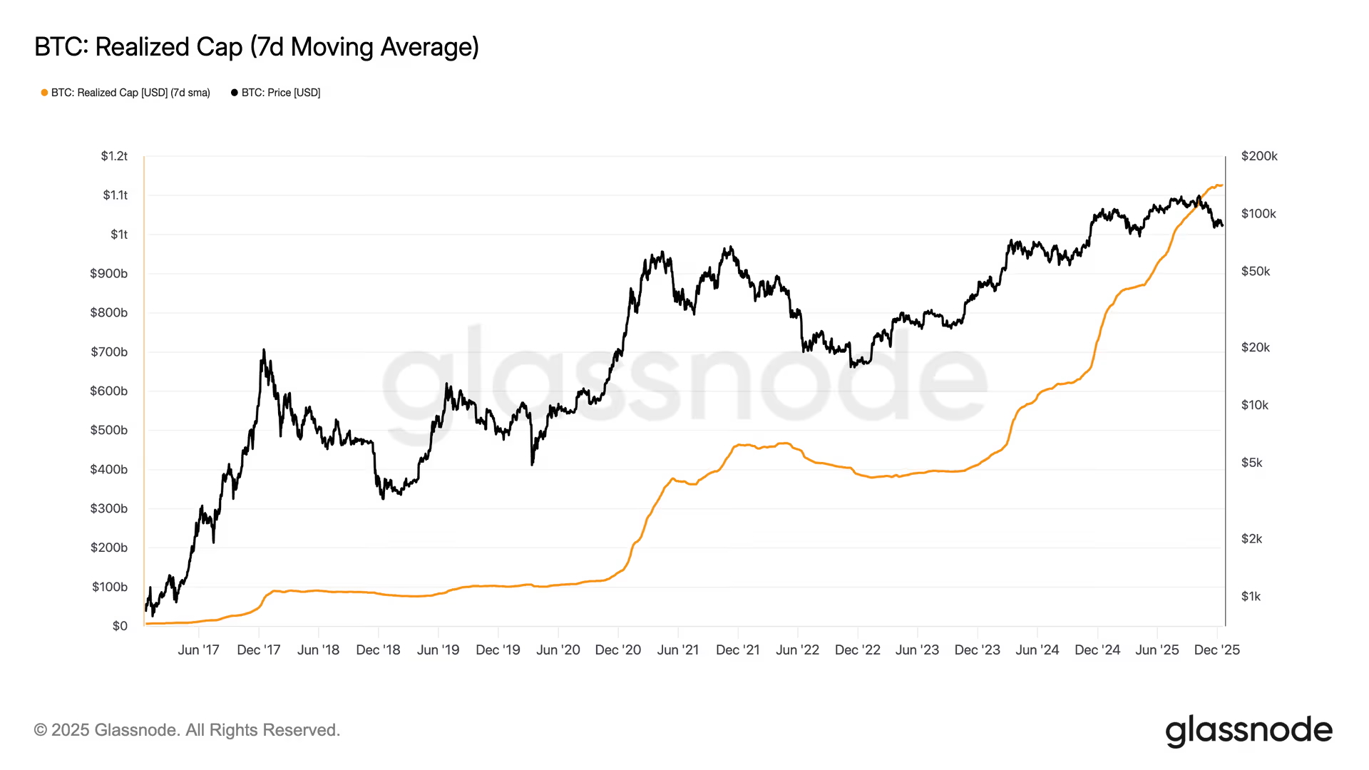 According to insights from blockchain analytics firm Glassnode, Bitcoin’s “Realized Cap” continues to hold strong at an impressive $1.125 trillion. This steadfast figure indicates an absence of large-scale capital exodus from the market, signaling that the structural integrity of the bull market remains firmly intact.