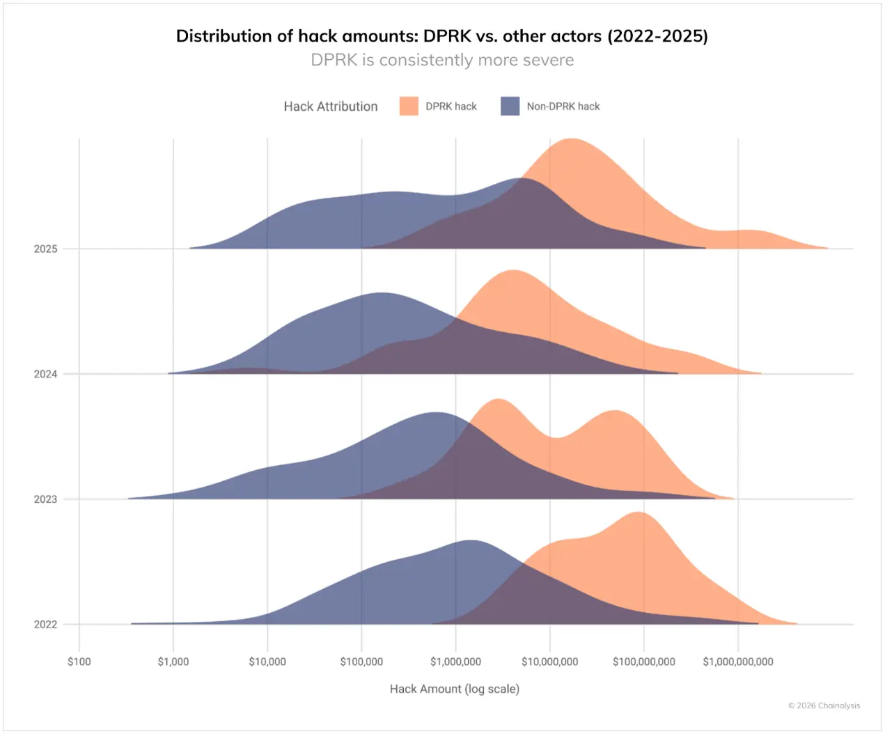 As observed in previous years, North Korea’s sustained cyberattacks consistently target significantly higher values than those of other hacking groups. As the chart below illustrates, from 2022 to 2025, North Korean hacks predominantly occupy the highest value brackets, whereas non-North Korean attacks show a more normalized distribution across all theft sizes. This pattern further indicates that when North Korean hackers strike, they aim for large services to maximize impact.