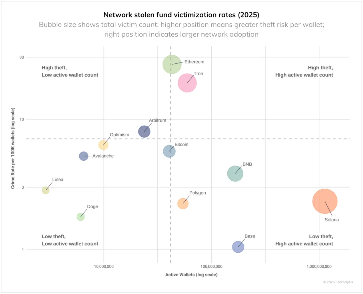 Network-specific victim data provides further insights into which areas pose the greatest threat to crypto users. The chart below shows victim data adjusted for the number of active personal wallets on each network. Measured as a crime rate per 100,000 wallets in 2025, Ethereum and Tron exhibit the highest theft rates. Ethereum’s large user base contributes to its high theft rate and victim count, while Tron’s ranking indicates a significant theft rate despite a smaller active wallet count. In contrast, Base and Solana show lower victim rates despite their substantial user bases.