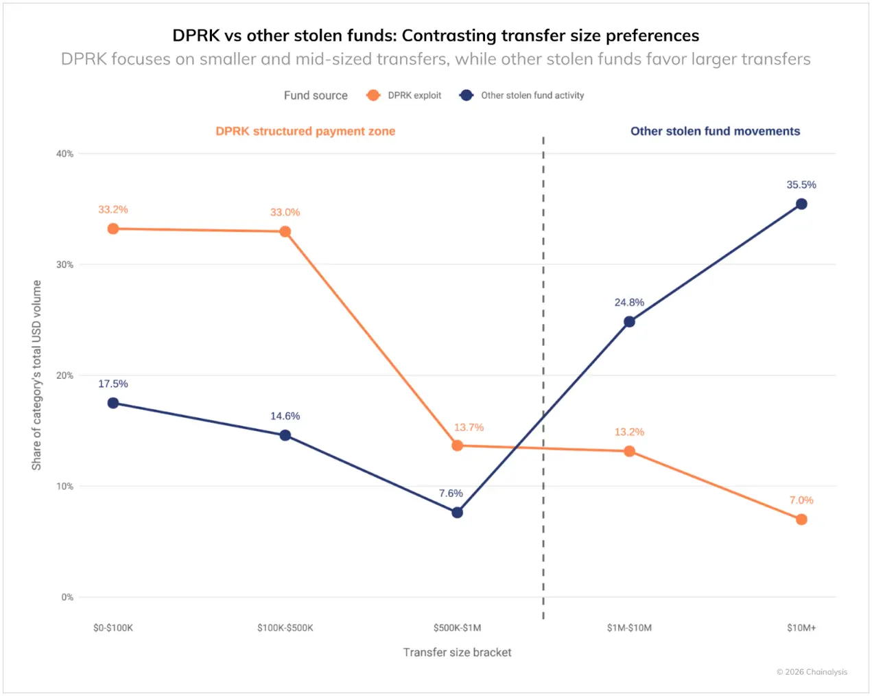 North Korean laundering activities exhibit a distinct “batching” pattern, with over 60% of transaction volume concentrated below $500,000. In contrast, other hackers typically move over 60% of their funds on-chain in batches ranging from $1 million to over $10 million. While North Korea often launders higher total amounts per incident than other hackers, they segment their on-chain transfers into smaller batches, underscoring the complexity of their laundering methodologies.
