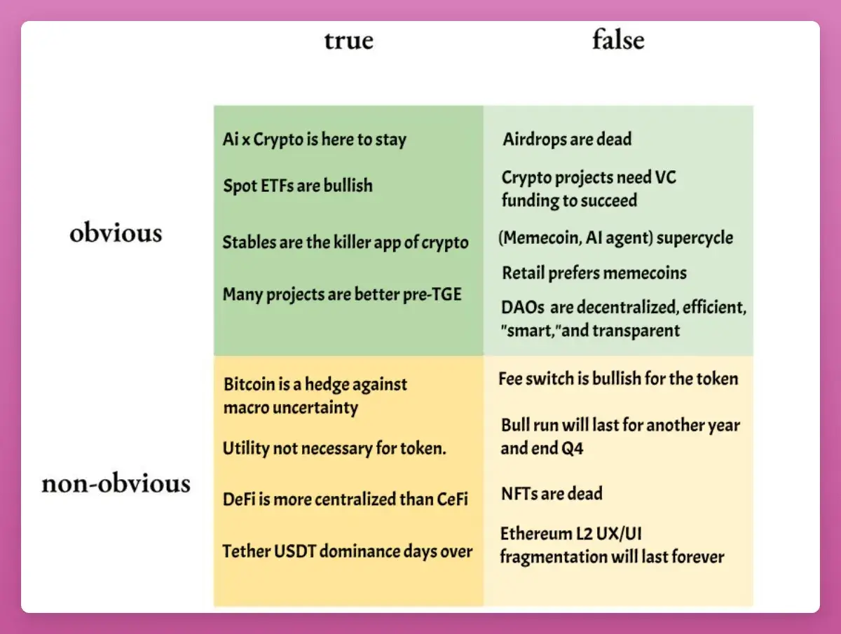 A year ago, I published “Truths and Lies of the Crypto Market in 2025.” While the prevailing sentiment was focused on ever-higher Bitcoin price targets, my aim was to explore a differentiated framework—to identify overlooked, misunderstood, or even disliked ideas that the mainstream might be missing. The goal was simple: uncover contrarian insights for strategic positioning.