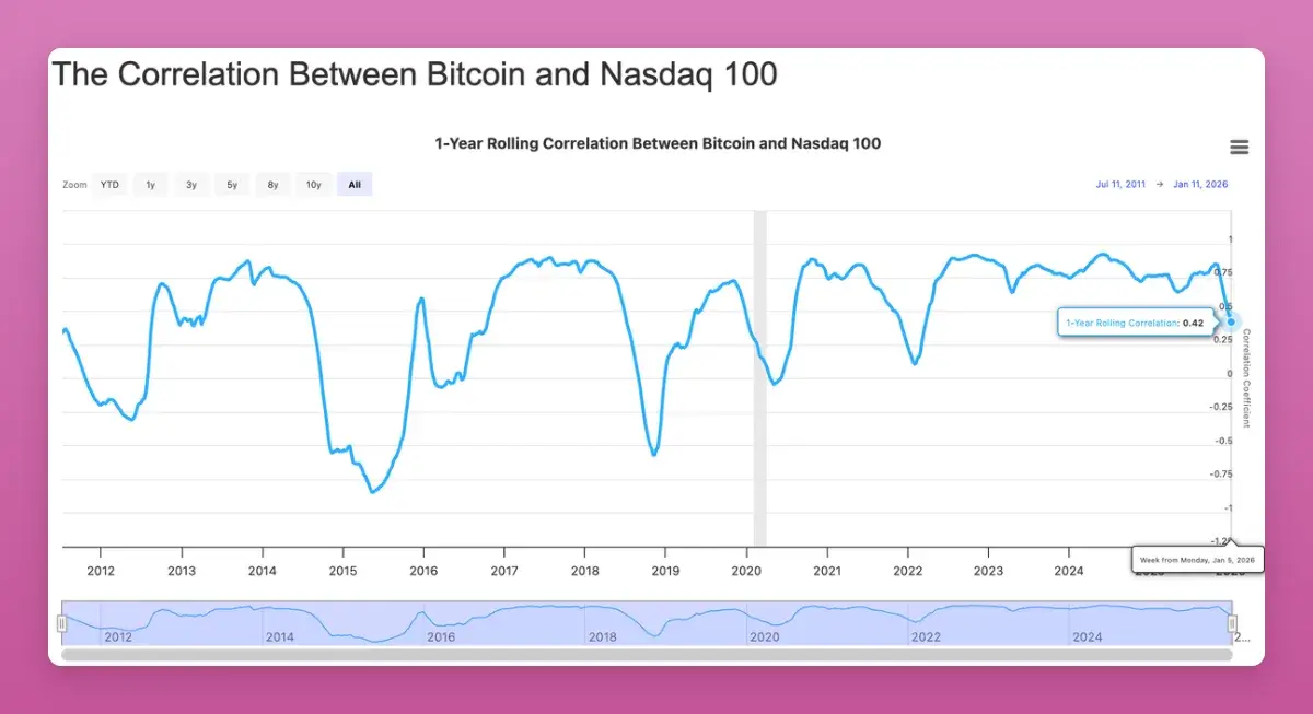 Crucially, Bitcoin’s correlation with traditional risk assets like the Nasdaq has plummeted to its lowest point since 2022 (-0.42). While many hoped for an upward correlation, this decoupling is a long-term bullish signal. It positions Bitcoin as the non-correlated portfolio asset that institutions are actively seeking.