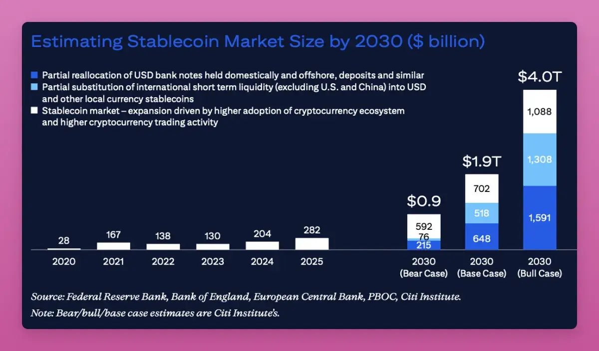 Stablecoins are undeniably entering the mainstream consciousness. A personal anecdote illustrates this perfectly: while renting a motorcycle in Bali, I was asked to pay in USDT on TRON. Although USDT’s dominance within the stablecoin market dipped from 67% to 60%, its overall market capitalization continued to expand. Citibank’s projections are even more ambitious, estimating the stablecoin market could swell to $1.9 trillion to $4 trillion by 2030.