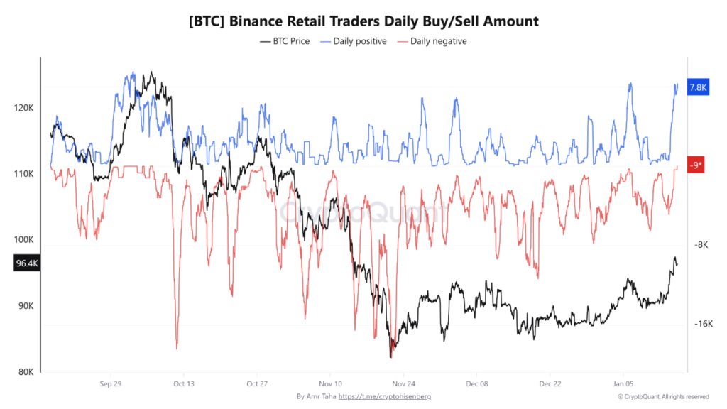 Adding another layer to the market’s complexity, recent on-chain data from Binance reveals intriguing investor behavior. As BTC momentarily pushed past the $97,000 threshold, a notable increase in retail buying was observed. Simultaneously, the exchange experienced a massive net outflow of nearly $3 billion in BTC. This dramatic shift saw net outflows escalate from -$1 billion to -$3 billion in a mere 15 days.