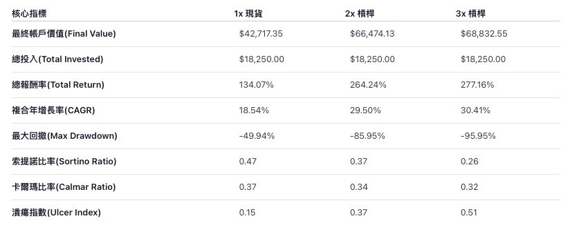 - 3x Leverage: Delivers extremely poor long-term value and is fundamentally unsuitable as a DCA tool due to its susceptibility to volatility drag and catastrophic drawdowns.