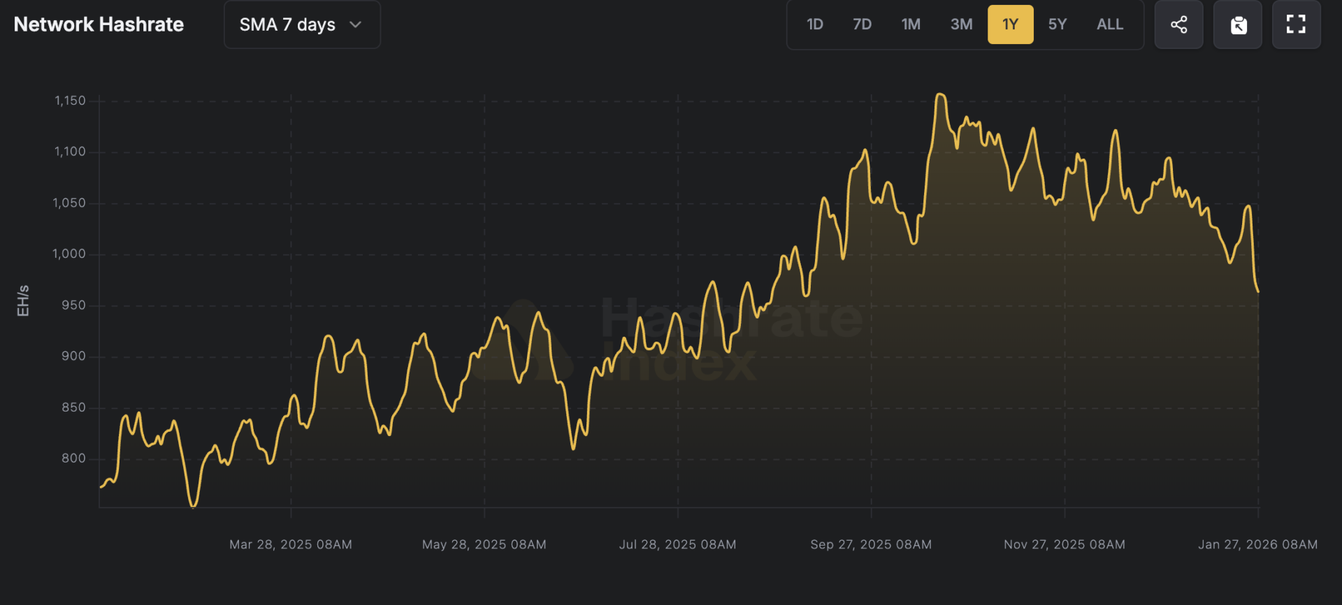 Recent data from Hashrate Index reveals that Bitcoin’s 7-day moving average network hashrate has dropped to 993 EH/s, a nearly 15% decline from its historical peak last October. Adding to this concern, JPMorgan analysts project that by December 2025, Bitcoin miners’ average daily block reward revenue per EH/s will fall to an all-time low of $38,700.