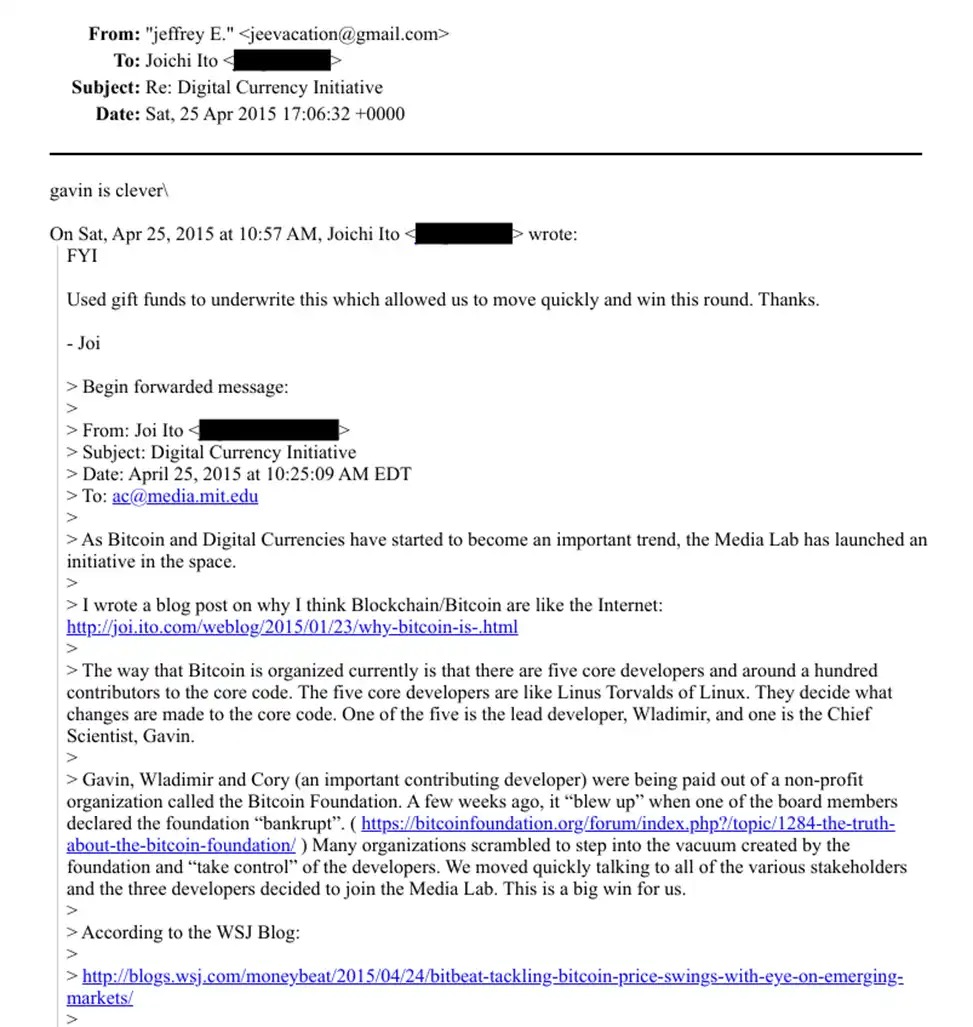 At the time, Epstein’s anonymous donations to the MIT Media Lab were unknown to the public, and his scandal had not yet broken. Joi Ito, then director of the Media Lab, emailed Epstein expressing gratitude. He not only explained Bitcoin’s development operations but also credited Epstein’s funding for enabling the lab to “move quickly and achieve great victories,” as “many organizations wanted to take advantage of the vacuum to control Bitcoin developers.” Epstein’s brief reply to Ito was a simple compliment for Andresen: “Gavin is smart.”