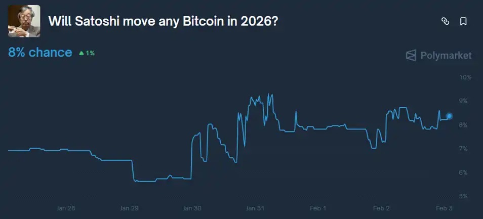 Following the latest disclosures of the Epstein files, the probability on the prediction market Polymarket for “Satoshi Nakamoto’s Bitcoin address showing activity in 2026” briefly surged from approximately 6% to 9.3%, currently stabilizing around 8%.