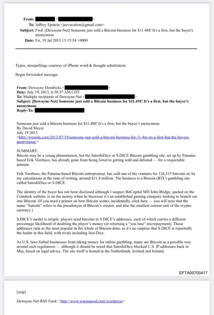 Epstein also received news about the sale of the once-prominent Bitcoin gambling site, Satoshi Dice, for $11.4 million.