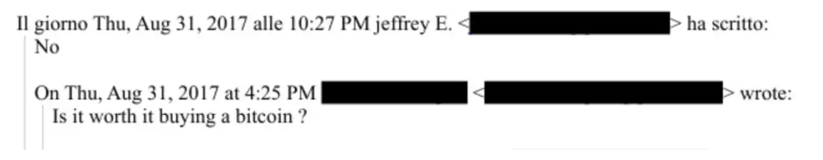 If Epstein indeed met Satoshi Nakamoto, it appears he wasn’t swayed by their vision. In an email exchange on August 31, 2017, when asked if it was “worth buying a Bitcoin,” Epstein curtly replied, “No.” At that time, a single Bitcoin was trading for less than $5,000.
