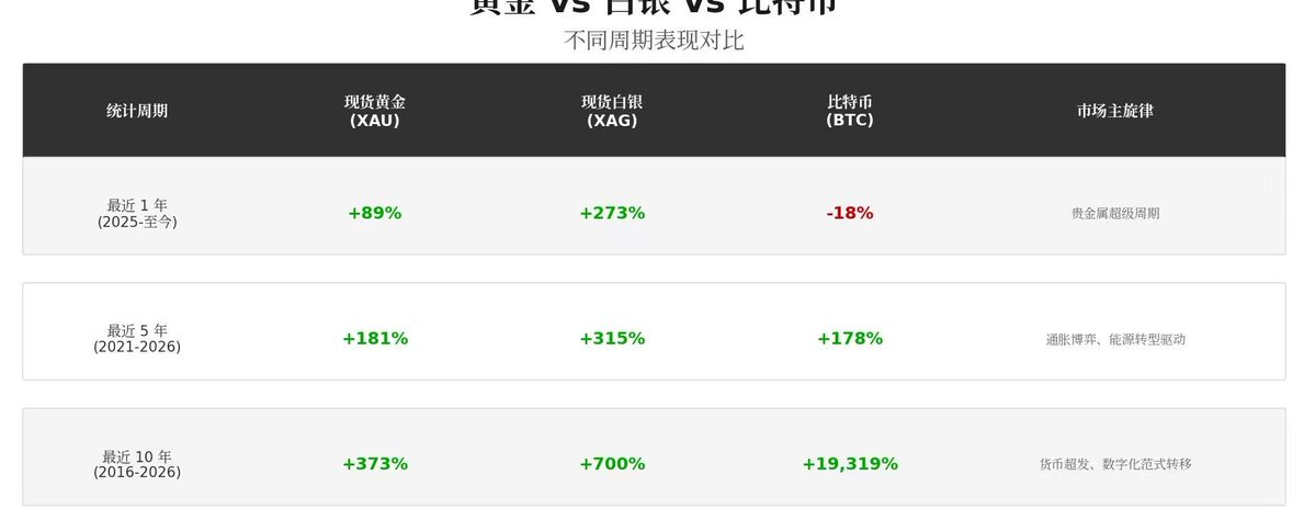 - Understand Asset Positioning and Allocation Goals: Gold and silver retain strong “safe-haven” characteristics during macroeconomic uncertainty, making them suitable for defensive allocations. Bitcoin, currently, is better suited for periods of rising risk appetite and when technology growth narratives dominate. Resist the urge to chase quick riches with gold. For inflation hedging and risk aversion, consider gold. For long-term high returns, consider Bitcoin (but be prepared for potential -70% drawdowns).