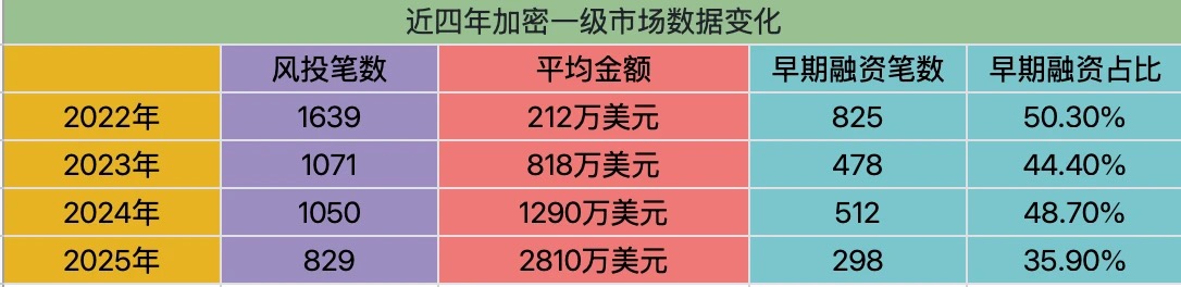 Direct data paints a stark picture: over the most recent four-year cycle (2022-2025), excluding specific primary market activities such as M&A, IPOs, or public fundraising, the number of funding rounds in the crypto industry has exhibited a pronounced decline (1639 > 1071 > 1050 > 829).