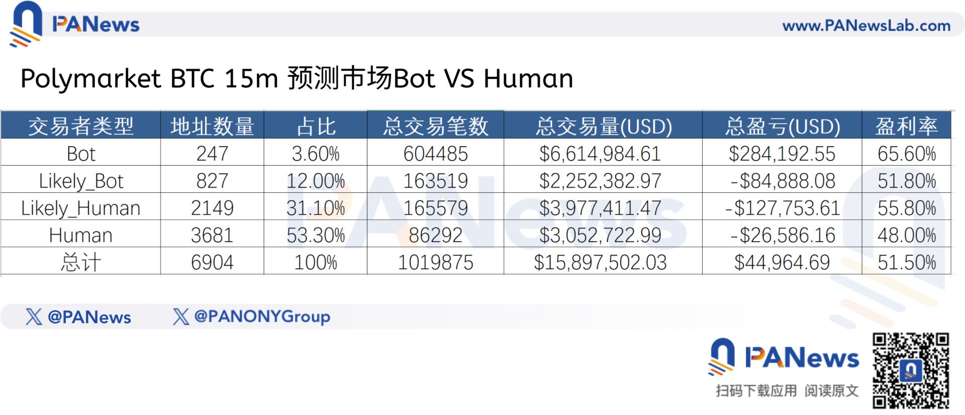 Recently, the analytical experts at PANews delved deep into the Bitcoin 15-minute price prediction market. Our comprehensive data review, spanning roughly three days, encompassed 291 distinct short-term markets and a staggering 1.05 million transactions. What emerged from this vast dataset was far more than cold statistics; it unveiled an intense, unvarnished battle between sophisticated algorithms and raw human intuition.
