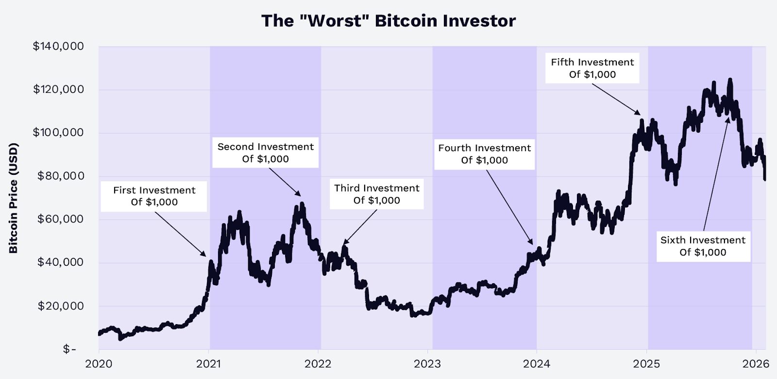 Analysis of Glassnode data highlights the enduring value of long-term conviction. Consider a hypothetical “worst-luck” Bitcoin investor who, from 2020 to 2025, invested $1,000 annually at Bitcoin’s absolute highest price each year. Their total investment of approximately $6,000 would have grown to roughly $9,660 by December 31, 2025, and about $8,680 by January 31, 2026, yielding returns of approximately 61% and 45% respectively.