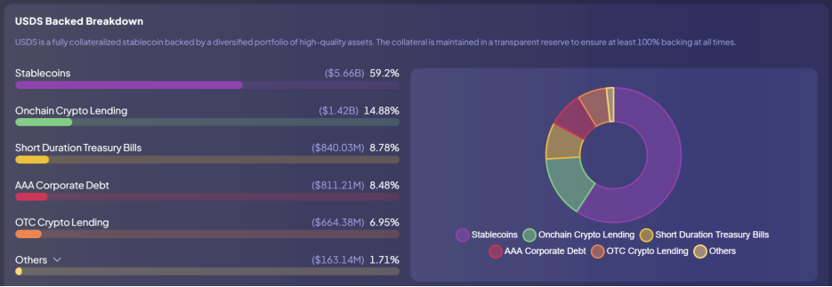 While USDS has indeed diversified its assets, stablecoins (specifically USDC) constitute nearly 60% of its reserves, far exceeding the over-collateralized portion (20%).