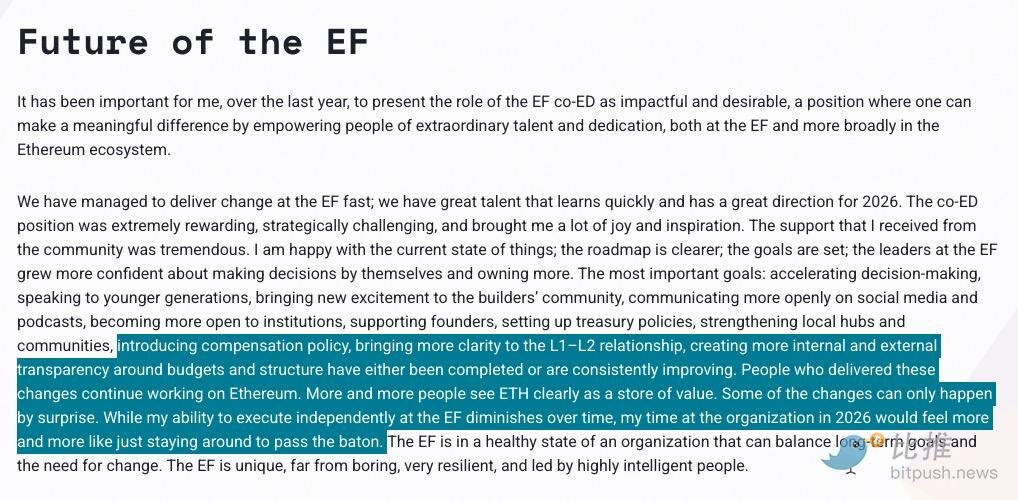 - He believes the Ethereum Foundation and the broader ecosystem are “in a healthy state,” signaling a belief that his mission was accomplished and it was time to “pass the baton.”