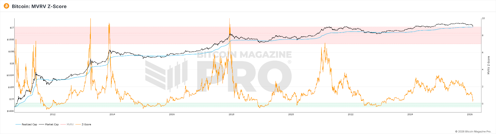 The MVRV Z-Score is an on-chain valuation metric that assesses Bitcoin’s market value by comparing its current market capitalization to its realized value (the aggregate value of all BTC based on the price at which each coin last moved on-chain). Traditionally, a Z-Score exceeding 7 signaled an overheated market ripe for selling, while a score below 0 indicated extreme undervaluation and a buying opportunity.