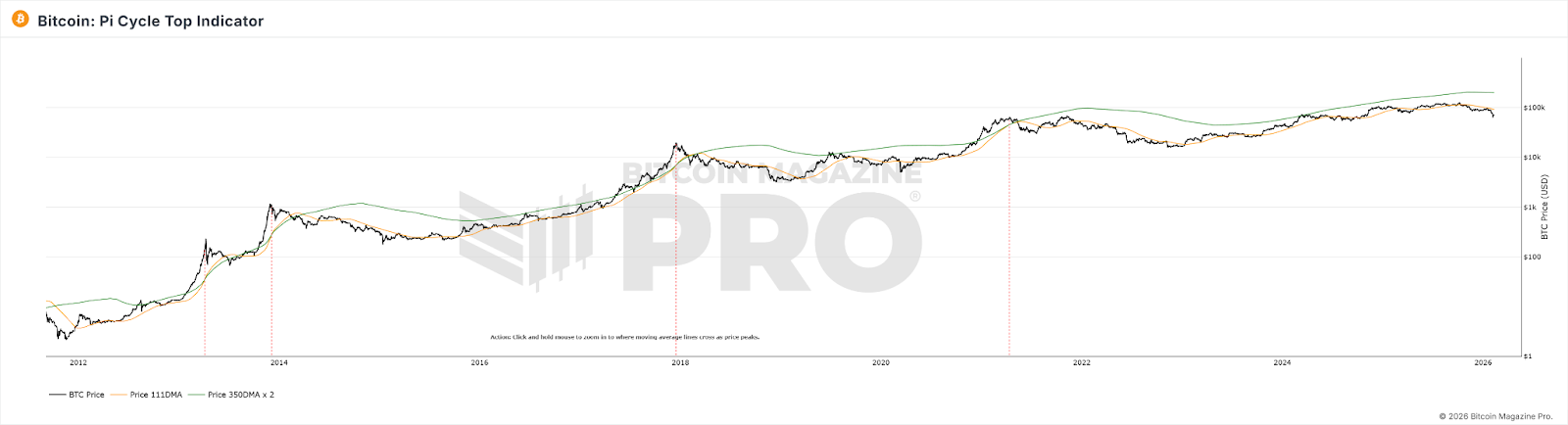 Developed by Philip Swift, the Pi Cycle Top indicator identifies market peaks by signaling when the 111-day moving average crosses above twice the 350-day moving average. This indicator accurately pinpointed market tops in 2013, 2017, and April 2021.