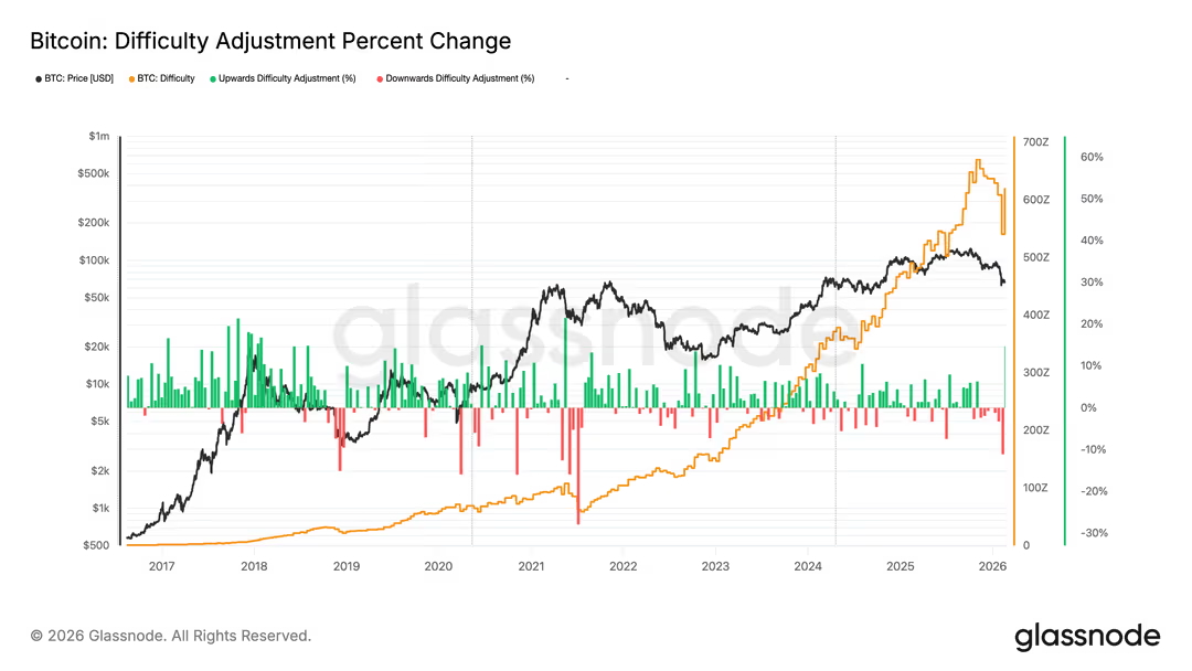The previous difficulty adjustment saw a 12% downward revision, primarily due to a sharp decline in hash rate. This downturn was largely attributed to extreme winter storms across the United States, which compelled several major mining operations to temporarily scale back or halt activities, marking the most significant setback for mining since late 2021.