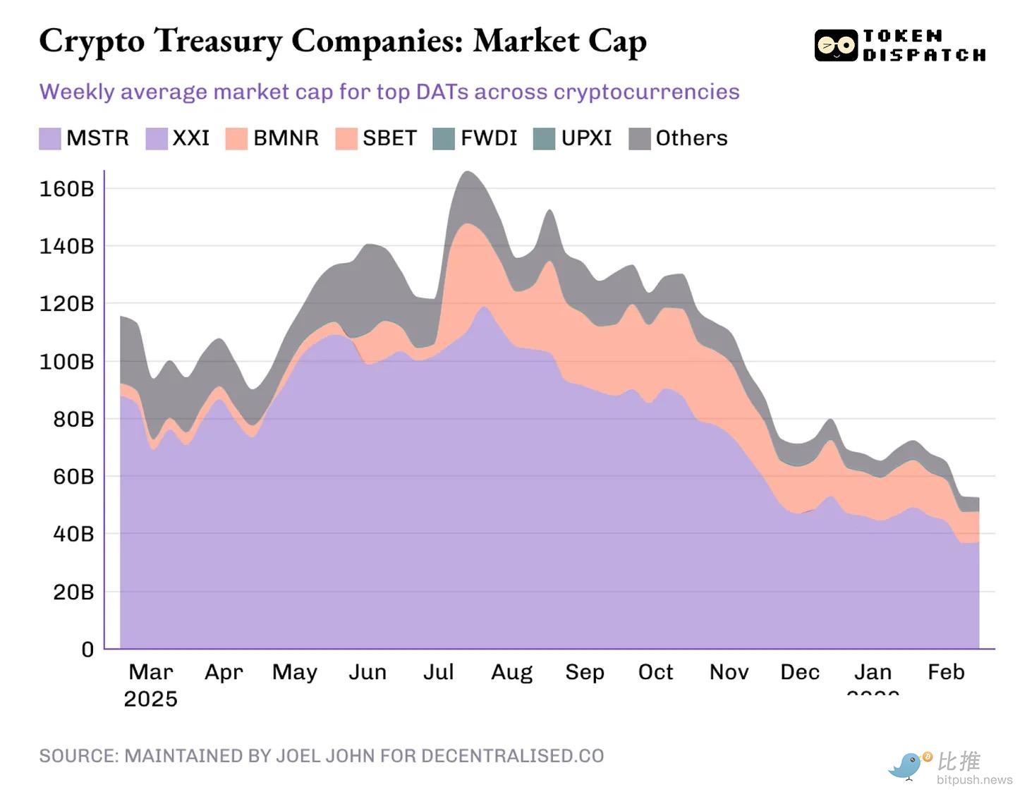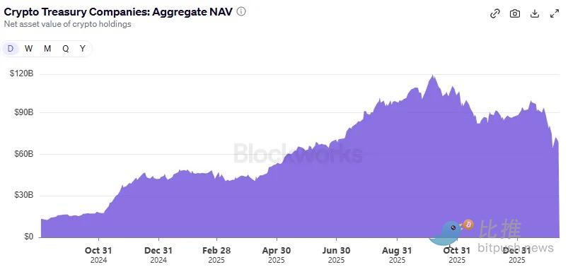 Between 2024 and 2025, a frenzy of over 30 companies vied to reposition themselves as DATs, amassing reserves in Bitcoin, Ethereum, SOL, and even meme coins. At its zenith on October 7, 2025, these DATs collectively held $118 billion in cryptocurrencies, boasting a combined market capitalization exceeding $160 billion. Fast forward to today, their crypto holdings have shrunk to $68 billion, and their aggregated market cap, now trading at a discount, barely surpasses $50 billion.