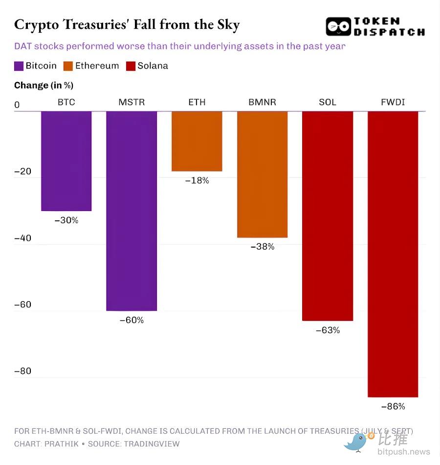 When a stock no longer commands a 1.5x multiple of its asset value, each newly issued share yields less cryptocurrency. The once-favorable premium transforms into a detrimental discount. Over the past year, the stock prices of leading Bitcoin, Ethereum, and SOL DATs have experienced declines even steeper than the cryptocurrencies themselves.