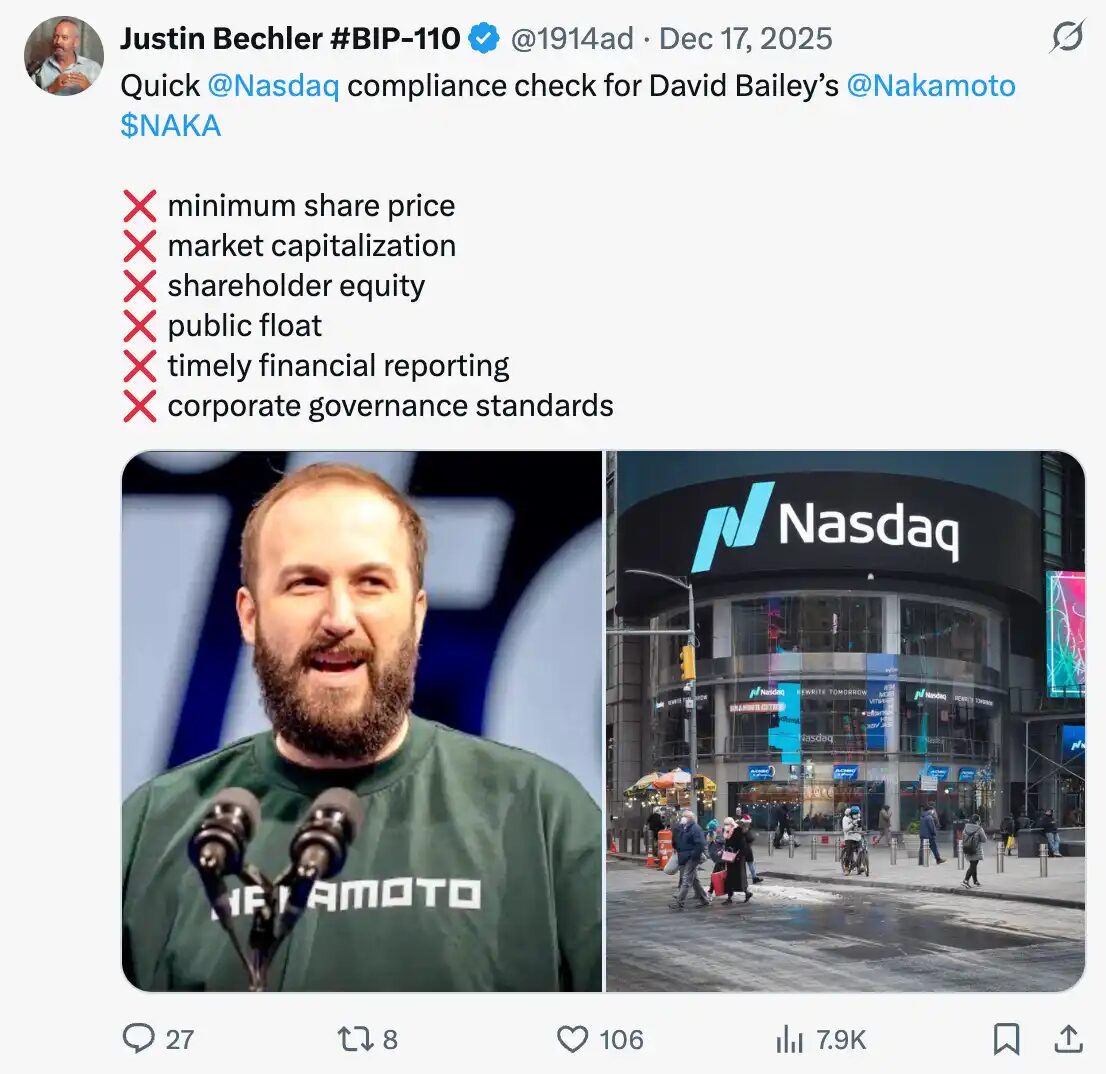 On December 10th, Nasdaq issued a delisting warning to Nakamoto, citing its stock price falling below $1 for 30 consecutive business days. The company was given until June 8, 2026, to regain compliance by achieving a closing price of over $1 for ten consecutive trading days. Currently, the stock trades at 29 cents.