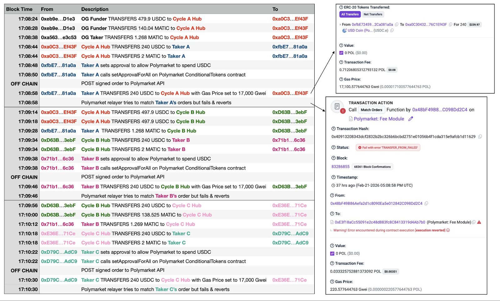From a cost perspective, each attack cycle demands less than $0.1 in Polygon network Gas fees and takes approximately 50 seconds. Theoretically, this allows for around 72 attacks per hour. One attacker reportedly deployed a “dual wallet cycle system” (alternating between Cycle A Hub and Cycle B Hub) to achieve fully automated, high-frequency exploitation. Hundreds of failed transactions have already been recorded on-chain.