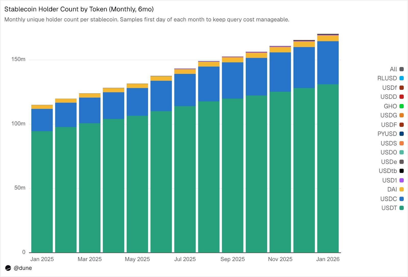 As of February 2026, a staggering 172 million unique addresses held at least one of the 15 analyzed stablecoins. USDT alone accounts for 136 million holders, USDC for 36 million, and DAI for 4.7 million. These three major stablecoins exhibit broad distribution, with their top 10 wallets holding only 23-26% of the total supply. Their Herfindahl-Hirschman Index (HHI)—a standard economic measure of concentration where 0 signifies perfect dispersion and 1.0 indicates a single holder—remains below 0.03, signifying a healthy level of decentralization in ownership.