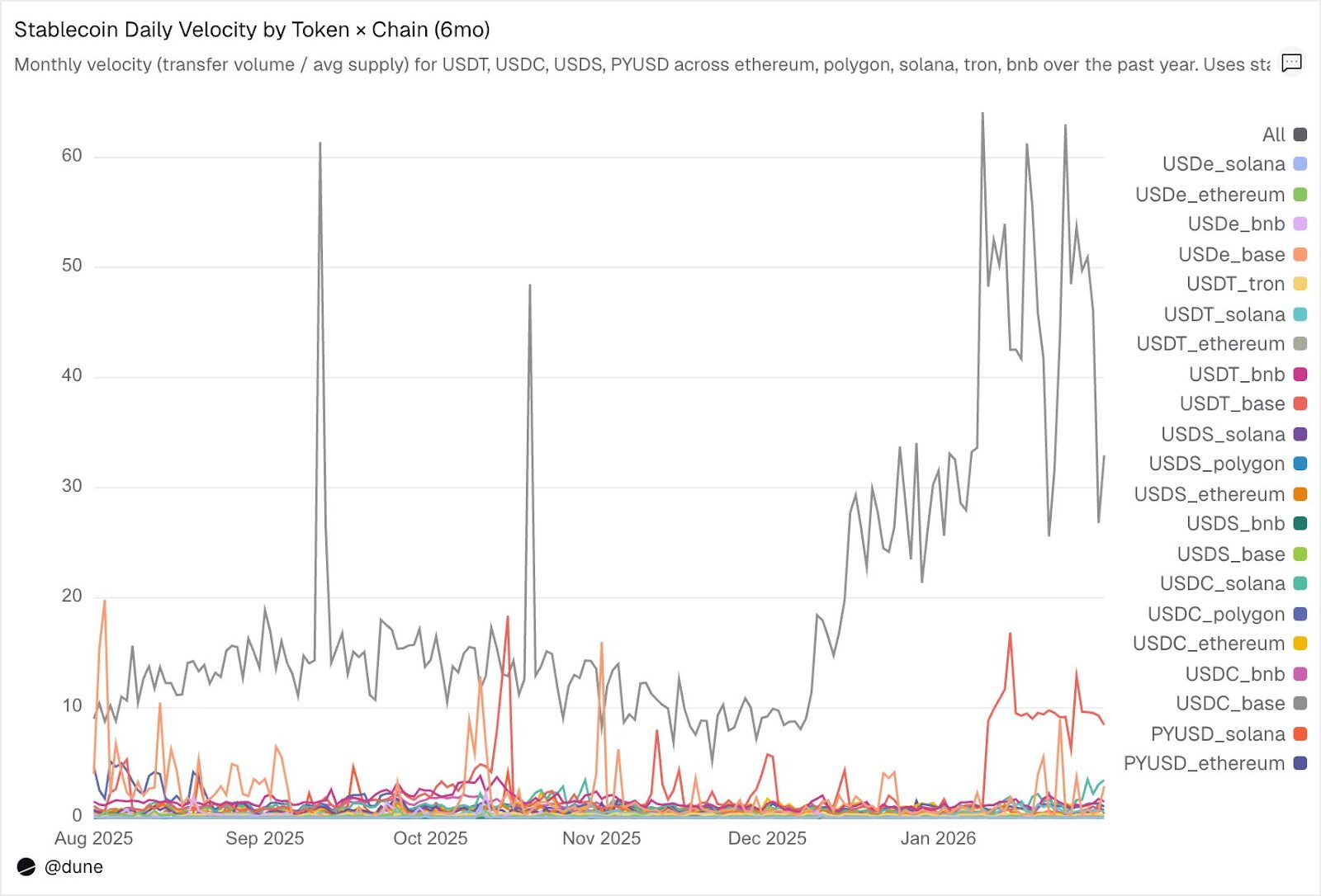 While supply and transfer volume each offer partial insights, velocity serves as the crucial link, providing a single metric to gauge whether a stablecoin on a particular chain functions as active infrastructure or as passive, idle capital.