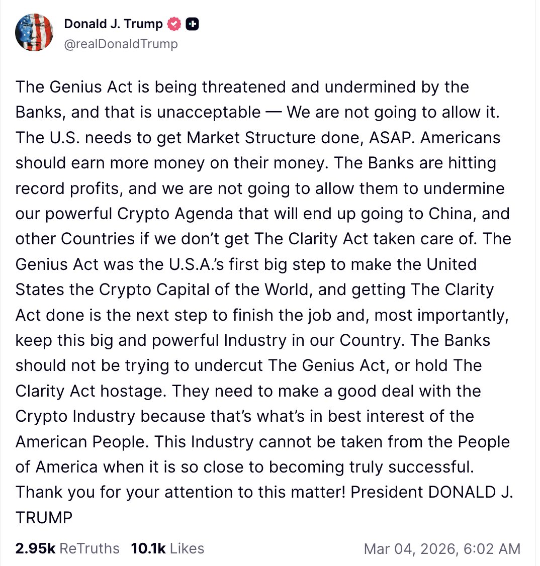 Responding to this perceived obstruction, Trump reiterated his strong condemnation: “Banks should not undermine the GENIUS Act behind the scenes, nor should they hold the CLARITY Act hostage as a bargaining chip. They must negotiate properly with the crypto industry; this is what truly serves the best interests of the American people.”