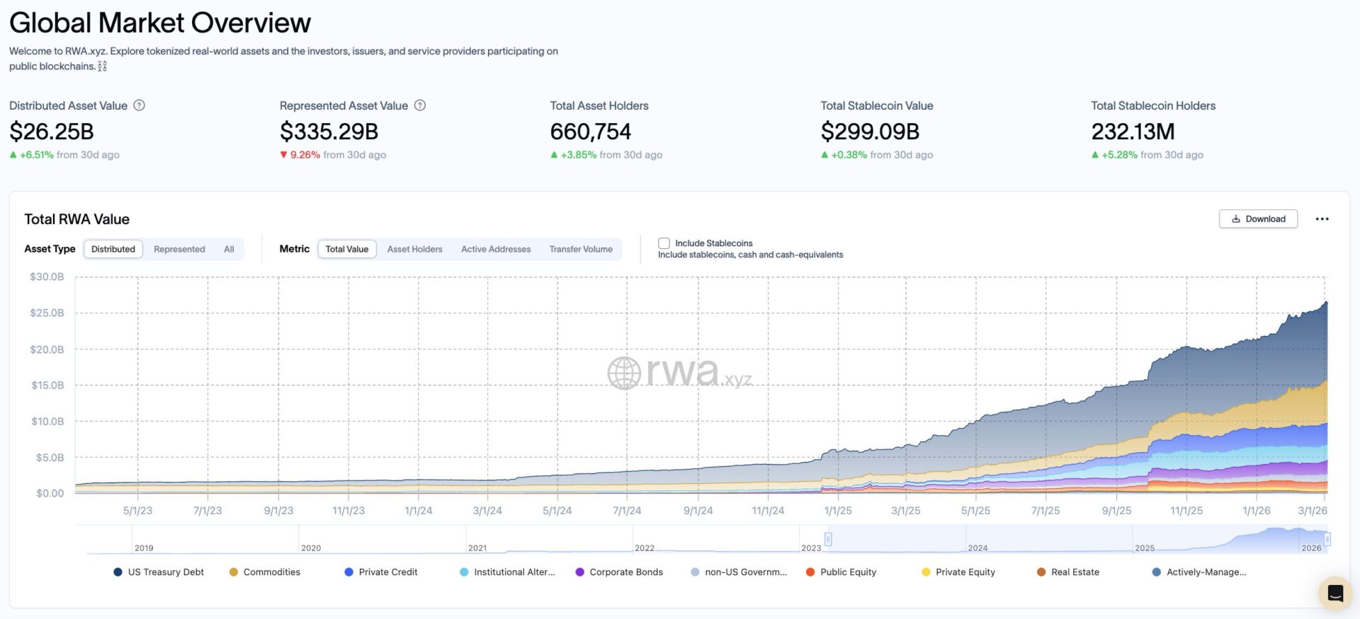 Image source: RWA.xyz. The global market size of tokenized Real-World Assets (RWA) is currently approximately $26.25 billion.