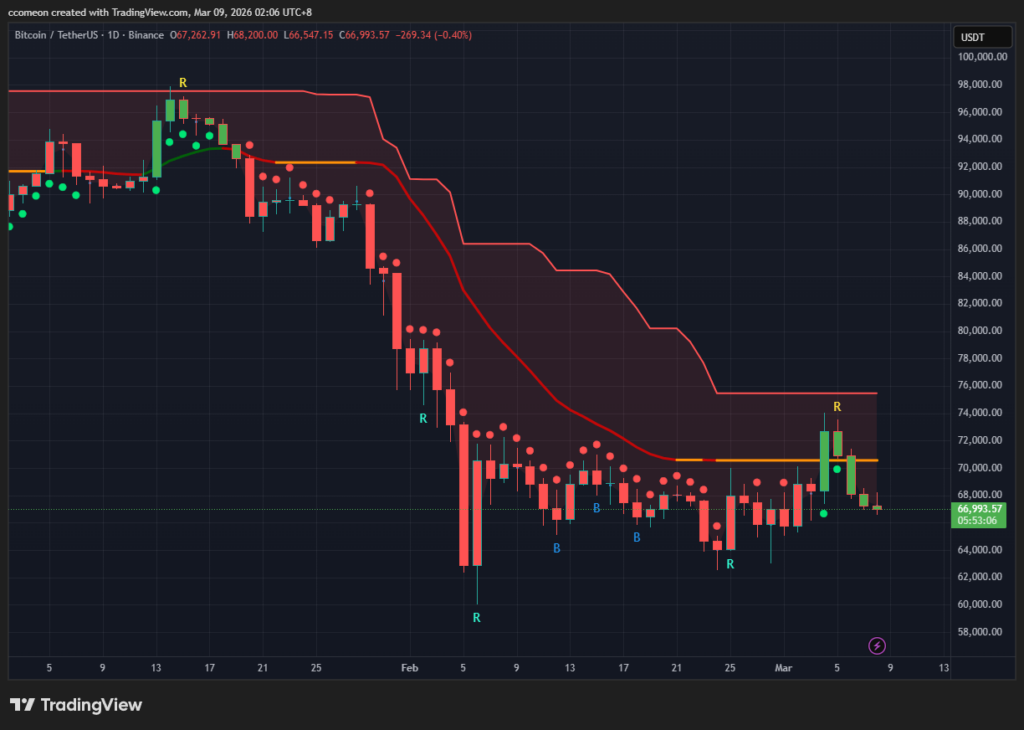 Amidst this backdrop, Bitcoin demonstrated surprising resilience last week, staging an unexpected rally that saw it breach $74,000. However, this momentum proved short-lived. As geopolitical concerns deepened towards the weekend, a flight to safety spurred a downturn across the broader crypto market. This shift caused Bitcoin to retreat, undoing its recent breakthrough of a short-term downtrend and settling back around the $66,000 level. The attempt at a trend reversal has, for now, failed. For Bitcoin to firmly establish a bullish reversal, it needs to decisively hold above $70,000. Should an opportunity arise this week for Bitcoin to re-challenge the $70,000 threshold, it could signal a potential entry point for long positions; conversely, a failure to do so would necessitate a cautious, hedging approach.