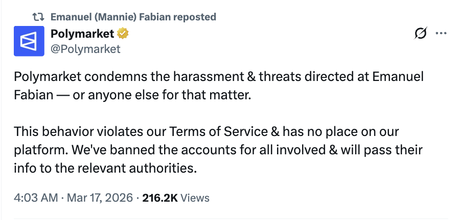 Polymarket responded by condemning the harassment and threats against Emanuel Fabian, stating that such behavior violates its terms of service. The platform emphasized that prediction markets rely on the integrity of independent reporting, and any attempt to pressure journalists into altering their coverage not only undermines journalism but also the market itself. This principled stance is undeniable; if market prices depend on external factual sources, then pressuring those who provide these facts directly erodes market integrity.